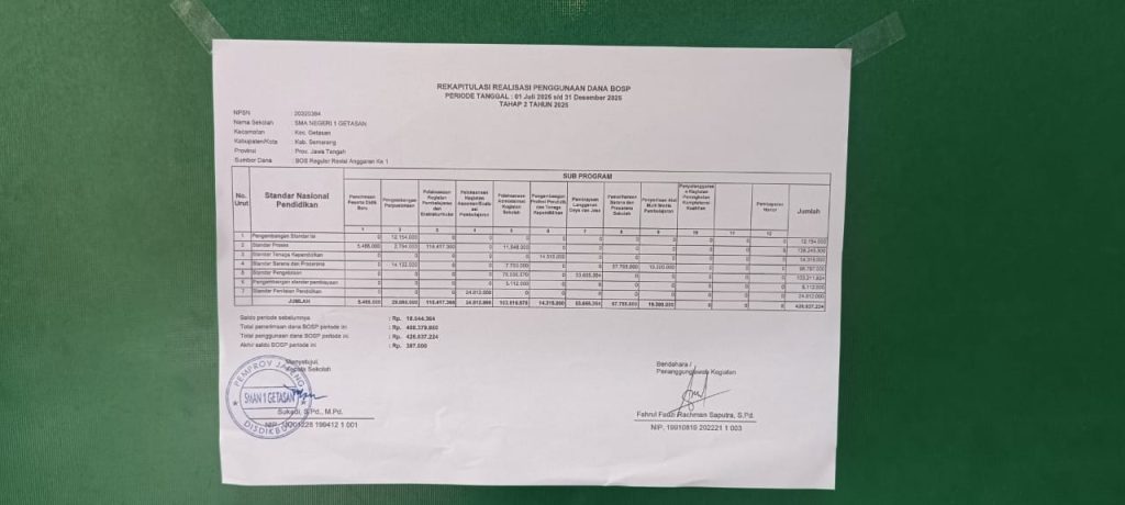 Sebagai bentuk komitmen terhadap prinsip transparansi danakuntabilitas publik, SMAN 1 Getasan menyajikan informasi pengelolaanDana Bantuan Operasional Satuan Pendidikan (BOSP) Tahun 2023 secaraterbuka kepada seluruh warga sekolah dan masyarakat. Pengelolaan dana
